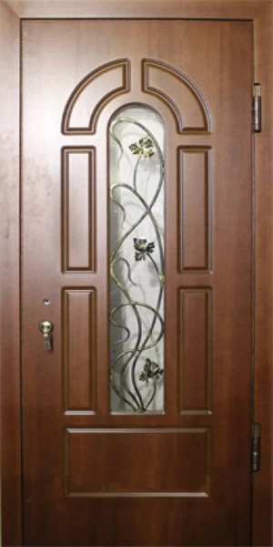 Часто декорирование дверей ковкой используют вместе со стеклом, отделывают витражным узором, используют зеркальные вставки. Стекло в этом случае применяется антивандальное, с трудом поддающееся разрушению.